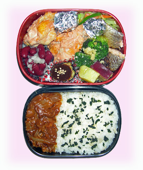週末はいよいよクリスマスホリデーですね~。(お仕事の皆さん、ごめんなさいっ)我が家は23日に横浜へショッピングに出かけ、24~25日は自宅で過ごす予定です。25日は3回目の結婚記念日。うーん。早いものだなぁ~。私たちは入籍の4ヵ月後に横浜で結婚式を挙げました。だから新婚生活が始まってすぐ結婚式の準備やら初めてのお弁当づくりやらでテンテコマイの新米主婦でした。あの頃に比べたら少しはお弁当メニューも増えたかなぁ~?でも「あ~ごめん!またこのおかずになっちゃった…」てことはしょっちゅうですね。^^; まぁ、それが妻の味なんだってことで、勘弁してね。何しろメニュー選びが一番面倒なんですから。。。~今日のお弁当メニュー~ ・ビーフストロガノフ ・タンドリーチキン(ニンニクヨーグルト風味) ・鮭のソテー ・さつま芋のレモン煮 ・赤インゲン豆のサラダ ・キャベツの野菜炒め ・茄子田楽 ・ブロッコリーのパルメザンソテー~ちょこっとレシピ~ビーフストロガノフ(1人分)バターで薄切りタマネギ小1/4個分と牛肉(薄切りor切り落とし)70gをフライパンにかけ、塩コショウを振り小麦粉を加えて炒める。デミグラスソース40ccと水40cc、コンソメ1/2個、ケチャップ大さじ1、とんかつソース大さじ1、砂糖小さじ1弱を加え、塩こしょうで味を調える。タンドリーチキン(ニンニクヨーグルト風味)(2本分)タマネギのみじん切り大さじ1とケチャップ大さじ1、ヨーグルト大さじ1、ニンニクみじん切り1/2片を合わせ、鶏手羽元を30分以上漬け込む。オーブントースター200度で12~15分焼く。(途中焦げそうな場合アルミホイルをかぶせて)…チキンにアルミを巻いただけでちょっぴり華やかになったような。f^^;