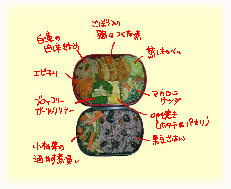 金曜日は心がはずみます♪だって明日はお弁当のこと考えなくていいんだもん!お弁当づくりは楽しいけれど、やっぱり頭を空っぽにして何も考えない日は必要なンです。^^;朝が弱いから、普段は少しでもラクをするために前の晩からある程度の下準備をしてます。包丁とまな板を使わないよう素材をあらかじめ切ったり、調味料を合わせておいたりとか。煮物系なども、あえて忙しい朝に作らなくていいものは前の晩の夕食の支度時に一緒にやっつけます。朝パパッと作ろうと思っても、時間はかかるしなかなか味が染みないし。だから夕食の支度はその分、ちょっとだけ手間どってると思います。というわけで、金曜日は夕食の準備はとても楽に感じちゃうんですよ~。自由時間も増えるぅ!遠くへショッピンへ行ったりするのはたいてい金曜日なんですけど、何も予定がない日は録りっぱなしのドラマなんか観てまったり過ごすの。今日は先週分の「あいのうた」を観よう。でもお天気がいいからウォーキングも行ってこようかな!金曜日ってサイコ~♪なのです。^^ ウフ。さて今日のお弁当は、 ・小松菜の煮びたし酒粕風味 ・ごぼう入り鶏のつくね煮 ・エビチリ ・マカロニサラダ ・蒸しキャベツ ・卵焼き(ホタテフレークとパセリ入り) ・ブロッコリーのガーリックソテー ・白滝のピリ辛炒めでした。~ちょこっとレシピ~エビチリお弁当用だからとにかく簡単に。最初に合わせ調味料を作っておきます。中華スープ100ccにケチャップ大さじ2/3・砂糖小さじ1・酒小さじ1、豆板醤を小さじ1/2~1/3(お好みで)加える。冷凍ムキエビ60gを解凍し、塩コショウ・酒で下味をつけておく。下味がついたら水気を切って片栗粉をまぶしておく。ネギみじん切り大さじ2、ショウガみじん切り小さじ1を小さめのフライパンで炒め、香りがたってきたらすぐ平らにならしてその上にエビをのせて蒸し焼き。裏返してエビが縮んできたら合わせ調味料を加えてしばらく煮たたせる。しっかりととろみがついたら出来上がり。ごぼう入り鶏のつくね煮は、「家中みんなのおべんとう応援団」に掲載されているレシピのまんまです。鶏挽肉にさっと茹でたささがきごぼうとタマネギのみじん切り・卵・酒・しょうゆ・片栗粉を加えて混ぜ、フライパンで焼く。だし汁、砂糖、醤油、酒で作っておいたタレを回しかけて煮詰まったら出来上がり。「家中…」のお弁当の本、SaLaDが一番頼りにしているレシピ本です。エビチリもここに載っているレシピからアレンジしたものです。素材別、色別など、こんなのが欲しい!というお弁当のおかず一品が探しやすく、またレシピ掲載量も886品とたっぷりです。ほんと、助かってます。^^黒豆ご飯は、ご飯2合に黒豆大さじ4、梅干1個を加えて普通の水加減で炊くだけ。梅干やお酢を加えると、ご飯がお赤飯みたいに赤い色になります。黒豆を売ってくれたデパートのおばちゃんに聞きました。^^ 梅干や酢を入れても酢っぱさはなくなります。お赤飯と同じようにごましおを振りかけて。