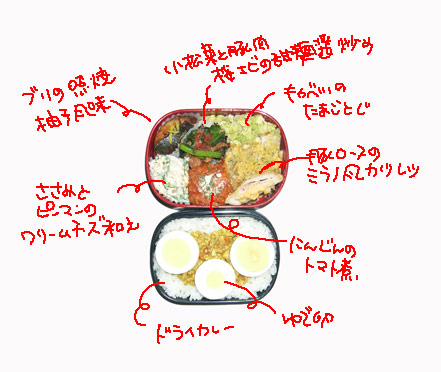 今日からいよいよ12月ですね~。師走に入った途端、なんとなく気持ちがそわそわしてきます。師走の「師」、魚ヘンをつけると「鰤」(ブリ)。これからがブリの旬なんですね。ということで、お弁当にブリ照りを入れてみました。(っていうかたまたまなんでブリがメインじゃないんですけどf(^^; )今日のお弁当で~す。 ・ドライカレーゆで卵のせ ・豚ロースのミラノ風カツレツ ・ブリの照り焼き柚子風味 ・キャベツの卵とじ ・ささみとピーマンのクリームチーズ和え ・小松菜と豚肉・桜エビの甜麺醤炒め ・にんじんのトマト煮でした。^^~ちょこっとレシピ~豚ロースのミラノ風カツレツ ロース厚切り1枚の厚み半分に切り込みを入れ、 筋切りをして軽くたたきのばし、塩こしょうをふる。 切り込みにスライスチーズと生ハムを挟み込む。 小麦粉を薄くつけてさっと卵にくぐらせ、少なめに パン粉をまぶす。上からオリーブオイルをひとたらし、 オーブントースター200度で8~9分焼く。にんじんのトマト煮はガーリックを効かせ、パルメザン&パセリをたっぷり振ってイタリアンな感じに。ドライカレーは作り置きして冷凍保存しておくと便利です。匂いが移り易いので、ご飯の中央をくぼませて箱に直接触れないようにしてます。豚ロースのミラノ風カツレツはたまたま残り物の生ハムを使いましたが、薄めのハムでOK。