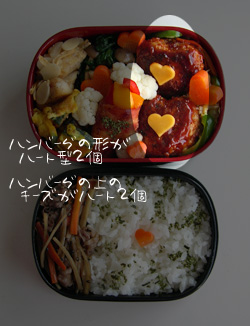 昨日の問題に多くのご解答をいただきまして誠にありがとうございました!!さて、栄えある30000点はどなたが獲得したのでしょうか・・とその前に、ご連絡です。今日のお弁当はお休みです。夫がダウンしてしまいました。^^;いや~、びっくりしました。昨日の夕方、夫からメールが入りまして「耳の下が痛い…おたふくかも…早く帰る…」え~っ、おたふく!?おたふくって、大人になってからかかると大変らしいのよね…。私もよく知らないけど…。だって、私もおたふくやったことないんだもん。・・・ってことは、え~っ、私にも移るかも!?夫が実家に「オレ、おたふくやってないよね?」なんてメールを送ったものだから、義母も心配してゆうべ電話してきました。「ん~、顔は腫れてないようなんですけど…。熱もないし…。^^;」でも結局、今日は気持ちが悪いということで会社を休んで病院へ。…ただの風邪でした。(´▽`) ホッただ、リンパ腺が腫れてるので頭痛や気持ち悪さの原因になってるらしいです。皆さんもお風邪には気をつけてくださいね。私もちょっと風邪っぴきでしたが…夫がこ~なっちゃ、気合で風邪と闘うわ~!(笑)さてさて、おまたせ致しました!正解者の発表です!!正解者は…えーと、えーと…えーっいらっしゃいません。え~~~~~~~っ!?皆さん、どうして?どうして??ノォオオオオオ!!昨日のコメントのお返事は、ガマンしました。最初のうち、内心ほくそえんでおりました。フフ。。皆、ひっかかってるひっかかってる♪でもそのうち、アレ?アレ??もしかして、わかってもらえないかも??いや、きっと、きっと、そのうち正解者が現れてくれるに違いない…。が…。時間切れでございます。解答を申し上げます。正解は、10個でした。確認のVTR写真。まず、ハンバーグの形がハートでした。このハンバーグがハート型に見えなかった方が7個とお答えになったのかな~と思います。ちょっとわかりづらかったかな~?^^;でも、下のハンバーグはハートっぽくないですか?そして、それぞれに乗っかってるチーズ。これで合計4個のハートです。続いて、にんじんグラッセのハートがご飯の箱とあわせて5個。これは、大丈夫だったでしょうか…。ハンバーグの4個と合わせて、合計9個。そして、、たぶんこれが見過ごされてしまったんでしょう。。。こんなところにっ!?ハートに見えるでしょ?見えるでしょ?けっこう頑張ったのよ、これ。(´m`)これで合計10個だったんです。・・というわけで、今回はSaLaDが圧勝ということで、30000点、ゲット!!やりぃ次回に続く。。。!?申し訳ありません。今日は家にでっかい病人がいるので皆様のところにご訪問できないかもしれません…。後は宜しく。