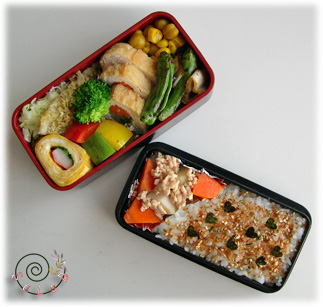 ごぼうとにんじんは千切りにしてだし汁でさっと煮ておく。ほうれん草は塩茹で。鶏ささみを観音開きにして、ごぼう・にんじんの千切り、ほうれんそう少々を乗せてくるくると巻く。油揚げは油抜きをして横半分に切り、1枚に開く。内側を上に、そこに肉巻きを乗せてくるっと巻き、爪楊枝で留める。さきほどのだし汁も使って、酒・醤油・砂糖・みりんを沸かし、肉巻きを入れて10分ほど煮る。火を消し、そのまま味を含ませる。冷めてからカット。