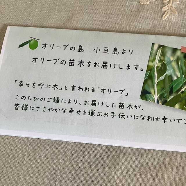 以前応募していたタケサン様のオリーブの苗木が小豆島から届きました!!過去記事はこちら ⇒ タケサンの懸賞でオリーブの苗木が当たる!!「幸せを呼ぶ木」とは……我が家に来てくれてありがとうございます!!大変丁寧なお手紙も入っていました♪ 届いたときはこのような感じでした。オリーブの苗木は初でしたが、植え付け方法もちゃんと入っていました。「幸せを呼ぶ木」を枯らしてはならない!!という使命感にかられ、すぐに植木鉢と培養土をかいにホームセンターへ!!取り急ぎ、鉢に植え替えて、お水をたっぷりあげました。小豆島から関西へようこそ。元気に育ってほしいです♪