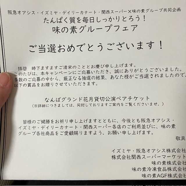 夏にプリマハムさんの懸賞でなんばグランド花月のチケットが当たりました。過去記事はこちら ⇒ プリマハムのよしもと劇場貸切公演、当選しました! プリマハムの吉本貸切公演に行ってきました!前回の公演は銀シャリやジャルジャルの漫才やコント、すっちー座長の公演を見ることができて非常にラッキーでした。今回は味の素さんの貸切公演ですね。「阪急オアシス・イズミヤ・デイリーカナート・関西スーパーたんぱく質を毎日しっかりとろう!味の素グループフェア」の懸賞でした。過去記事はこちら ⇒ イズミヤ×味の素の懸賞でなんばグランド花月の貸切公演を見に行こう!今までの経験から、今回も味の素さんのお土産があると思うのでそちらもおおいに期待してます!!味の素さん、ありがとうございます!!