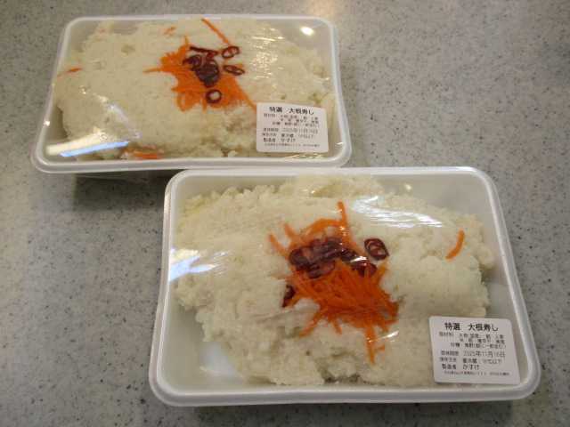 金沢には、冬になると食べるものがございます。毎年、これを食べないとなんとなく落ち着かない。もしかしたら、おいらだけかもしれませんが・・・という出だしを毎年、書くことにしました。(今年もまた、パクリました。)今年もかすけ食品 大根寿し今年も買いに行ってきました。10月末から販売開始とHPに載っていたので いつ行こうか?と迷ってました。今日行こう!と決めたのは、水曜日。でも、HPからの予約は5日前。問合せに店頭販売分の予約してもいいですか?と送ると大丈夫!という返事。わくわくしながらドライブしてきました。お店の前には、黒板に書かれたメニュー なに?店内に入ると麹漬けキムチが色々と並んでました。評判のいいキムチを2種類ほど買ってみました。今年の漬かり具合は、どうかしら?わくわく♪しゃきしゃきの大根。ちょうどいい甘さの麹。今年もうまいっす。お昼ご飯のおかずに 一切れ 大根の噛み応えがいいっす!物価高騰のためか内容量が減りました。今年は、2切れ入りで一パック1000円となってました。ただ、私が買ったモノは、大根が小さいので3切れ入りですとのことでした。私としては、小さめを1切れ食事の度に食べるのでちょうど良かったです。鶏皮のキムチ ちょっとだけ辛いけどそのまま食べることが出来たのでそんなに辛くないのかな。長いものキムチのほうが好みでした。12月には、エリンギのキムチを買ってみようと思います。隣に住む叔母と甥にお裾分けです。お昼ちょうど 叔母の家で在宅勤務をしている従兄弟が昼の買い出しから帰ってきたのでお昼のおかずに一品加えて~と渡して行きました。あっら~こんなにたくさん ありがとねぇ~~~と毎年 同じやり取りです。甥にLINEをすると中国にいるから嫁に取り行かせるから!という返事。夕方に甥嫁が来てくれたので姉にも配達してもらう予定です。かすけ食品さん情報今年は、10/29 から販売しています。※かすけストアさん今年の販売営業日は、水曜~土曜日のみ。時間は10:00〜13:00だそうです。予約しなくても店頭で買えるみたいなのですが予約したほうが安全です。店頭販売分が売り切れて買えないお客さんもいたそうです。過去のかすけ食品 大根寿し冬になると「よく読まれている記事」にあがってきます。2年前までは、ほとんど2013だったのですが、今年は2023,2024が上にきます。2024/11/22かすけ食品 大根寿し 20242023/11/25かすけ食品 大根寿し 20232022/11/25かすけ食品 大根寿し 20222021/11/22かすけ食品 大根寿し 20212020/12/04かすけ食品 大根寿し 20202019/12/13かすけ食品 大根寿し 20192018/11/21かすけ食品 大根寿し 20182017/11/29かすけ食品 大根寿し 20172016/12/07かすけ食品 大根寿し 20162015/11/29かすけ食品 大根寿し 20152014/12/13 かすけ食品 大根寿し 20142013/11/23 かすけ食品 大根寿し 20132012/12/26 冬になると食べるもの 20122011/12/10 大根寿し 2011