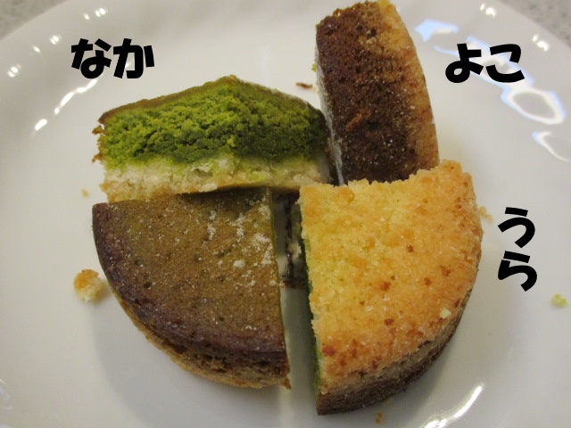 ホワイトチョコと宇治抹茶を練り込んだケーキ生地の中に、濃厚な抹茶のケーキ生地を絞って