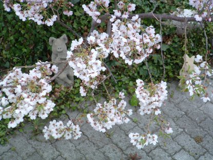 ようやく桜が咲き揃い始めました。今朝、窓から撮った桜。ぶーの後ろの桜の木はアイビーに覆われています。今日は風が強かったのでその風に吹かれて桜の花がゆらゆら揺れていました。せっかく咲いた花びらが散ってしまいそうで少し心配な今日でした。みなさんの周りの桜もそろそろ満開でしょうか。週末は晴れて暖かい、お花見日和になるといいですね♪2005-4-7