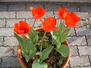 赤いチューリップが元気に咲いています。暖かすぎて花びらが開いてしまうくらい。別に植えた、パープルの斑模様のチューリップがなかなか咲かないと思っていたら何故か薄い黄色いチューリップが咲き始めました。何故?疑問の今日。2005-4-16