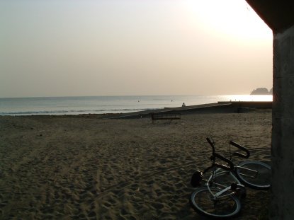 陽が沈む1時間くらい前。太陽がまっすぐ、まぶしくて江ノ島が翳んで見えない。手をかざすとぼんやり見えた。ふと、おじさんに「カメラは何?」と話しかけられた。その人は、富士山のまん中(真上)に落ちる夕陽を撮りに来たという。そのおじさんが言うには4/4と9/7の年に2回だそうだ。とてもきれいだそうで、まだ見たことがないと言ったら驚かれてしまった。4月の寒いこの時期の方がきれいに見えるそうだ。昨日もたくさん人が来ていたことを話すと、今日もそろそろ集まってくるという。わたしはホットの缶紅茶を買って犬と、落陽と富士山を待ったけれど、寒かったのでしぶしぶ諦めて、帰途に向かった。帰り道、おじさんの言った通り三脚片手に人がぞろぞろ歩いてきていた。今日も雲が多くて富士山は見えていなかったけれどもしかしたらあの後、見えたのかな?年に2回だけ なんて言われるととても惜しいことをしたような気がして帰ってきてから犬の足を洗いつつ少し後悔してしまいました。帰りがけに撮ったいちまい。富士山がきれいに見えたならこの画像、ちょうどまん中辺りに大きく富士山が見えてその上に陽が落ちるというはずだったのですね。明日から少しずつ右寄りに落陽の位置がずれていくそうです。そんな日の入りの季節のお話でした。2005-4-4