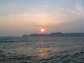 海と夕日は似合うなぁ。風が気持ち良くなった頃マリーナまで犬と散歩に行って来ました。海から涼やかな風が心地よく夕日が沈むのをじーっと見て帰ってきました。夕焼け雲もほんわりきれいでした。2005-8-3昨日は江ノ島の花火大会でした。花火の音がドーンドーンと聞こえ始めた頃夫と犬とわたしで、てくてく丘の上の花火スポットまで花火を見に行って来ました。遠く上がる花火はやっぱりとてもとてもきれいでした。