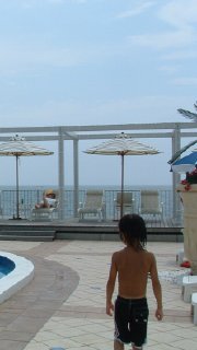 台風のようにあっという間に夏休みは過ぎて行きました。23日はなんとか晴れてマリーナのガーデンプールに行ってきました。たくさん泳いでたくさん日焼けしました。(ホントは日焼けの予定はなかった!)最年少の友だちRくん。パラソルの向こうは海まっすぐ水平線が広がっています。プールから芝を挟んで隣は去年、新しくできたマリーナのチャペル。晴れて空気の澄んだ日は海の向こうに江の島も富士山も一望できるそんなステキなロケーション。ここは時間がゆっくり流れてる。そう実感している2005年の夏です。8/26