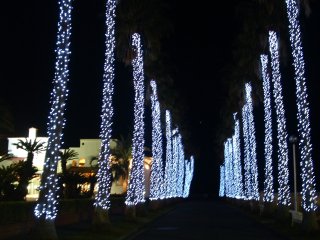 今日は18:00くらいマリーナへ。ずっとつづくヤシの木のライトアップ。突きあたりには堤防があってそして海です。ちょうど昨日の場所。ベンチの前にはいろんなクルーザーが停泊しています。クルーザー郡の左ずっと向こうにはいつもの江ノ島の灯台。そういえば今夜は月、出てたかな?夜空見上げなかったな。2005-11-02