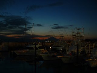 夕闇の中のマリーナ。クルーザーの間ずっと向こうに富士山。あっという間に日が暮れて闇の幕が降りてきました。今日はきれいな月夜です。2005-11-09