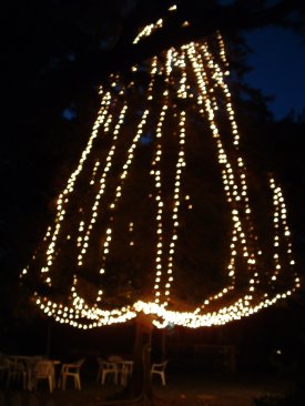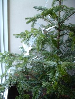 玄関の端に置いたツリー。 雪の結晶と鳩。それと透明のつららのオーナメント。(なんだかあんまり良くみえませんね(汗)もみの木は毎年少しづつ成長しているようです。この頃の犬の散歩は暗くなってからが多い。夜道をマリーナまで歩いて立ち止まって海岸線を見渡す。真っ黒の海に沿って134号線がネックレスのように灯りで繋がり江ノ島の灯台はショートケーキのろうそくのようにちらちら炎を灯している。遠く影をなす山並にもうっすらと灯りが見える。線香花火の落ちる瞬間のそんな弱々しい光。空を見上げて目を凝らせば砂をちりばめたような星の群れ。音もなく飛行機がゆっくり点滅しながら星の間を抜けてどこかへ飛んでいった。2005-12-20
