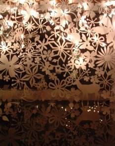 トードのクリスマス。窓に沿って切って飾りました。ここはうちでは目立たない場所。洗濯機の隣の窓です。それでも朝、陽が射すとトードの動物や花が影になって壁に映ります。夜は外に向けてひっそり光の影を放ちます。ツリーは生きてるモミの木。わたしの腰あたりまでしかない小さな木です。(少しずつ育っているような。)今年も陶器で出来た雪の結晶と鳩を飾りました。玄関にはつらら型のアイシクルライトを飾ります。あとはジングル♪とケーキが楽しみなそんなありふれたクリスマスです。2005-12-09ここ何日か散歩にデジカメを忘れてきれいな夕陽と富士山を撮れなくて惜しい思いをしています。最近は空気も澄んでいるせいか夕暮れがほんとうにきれいです。今日は半月。夜空の星もきれいに見えています。