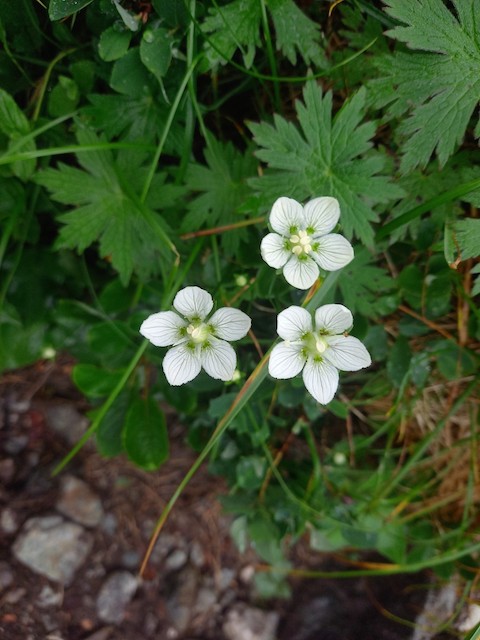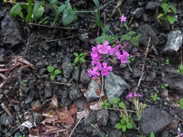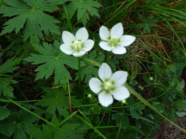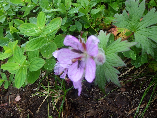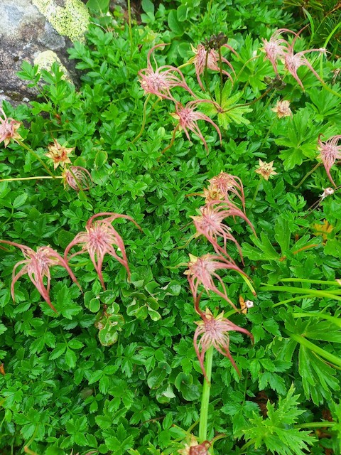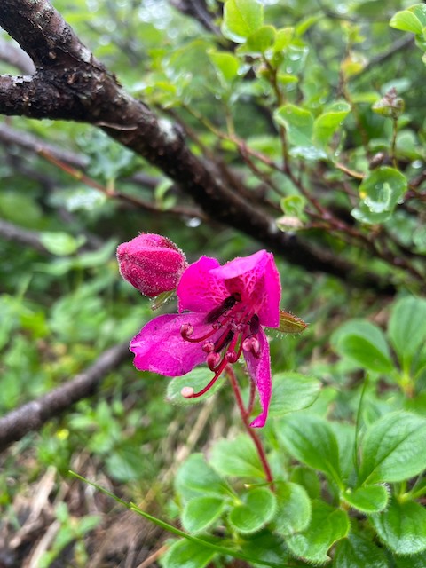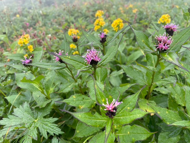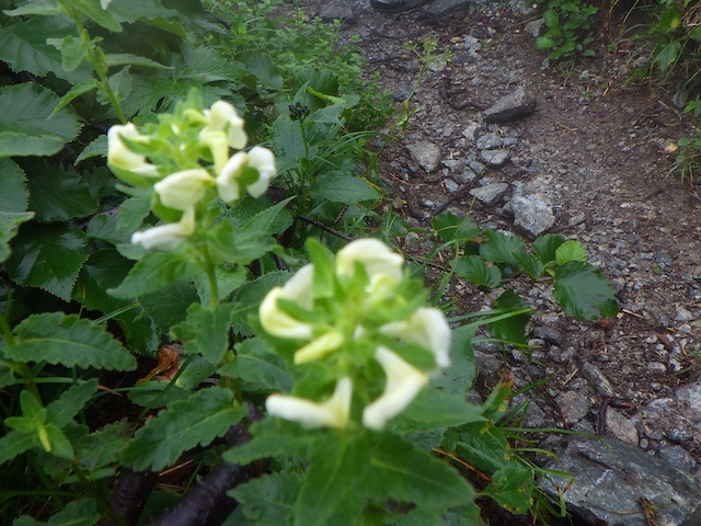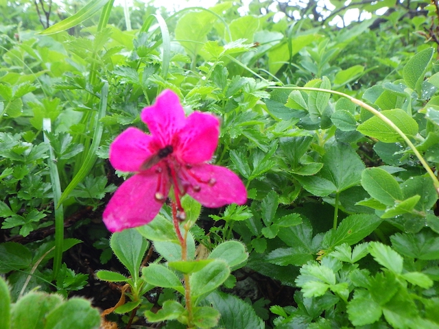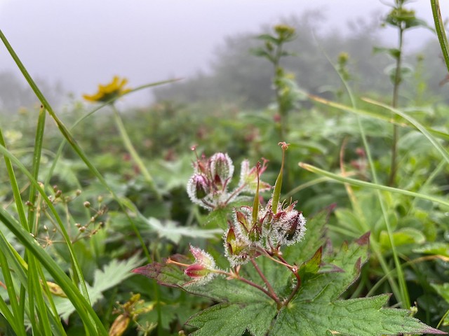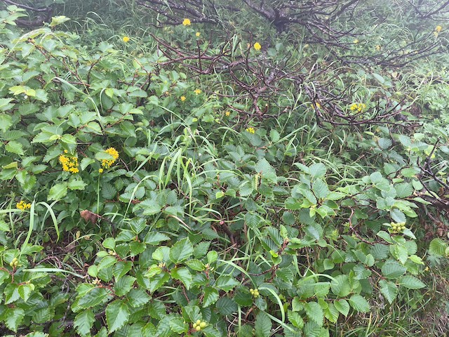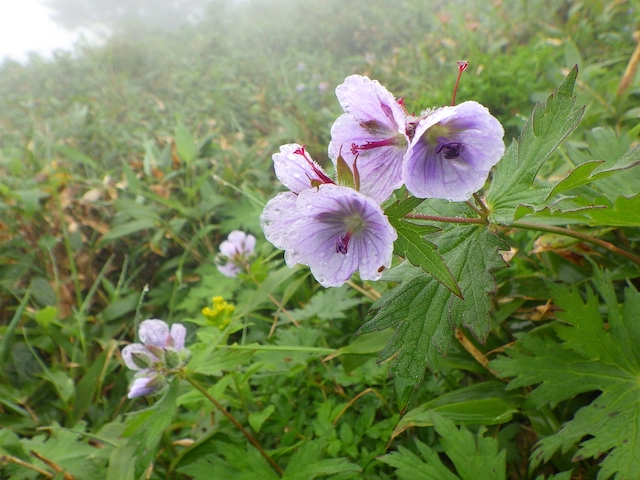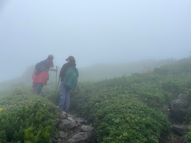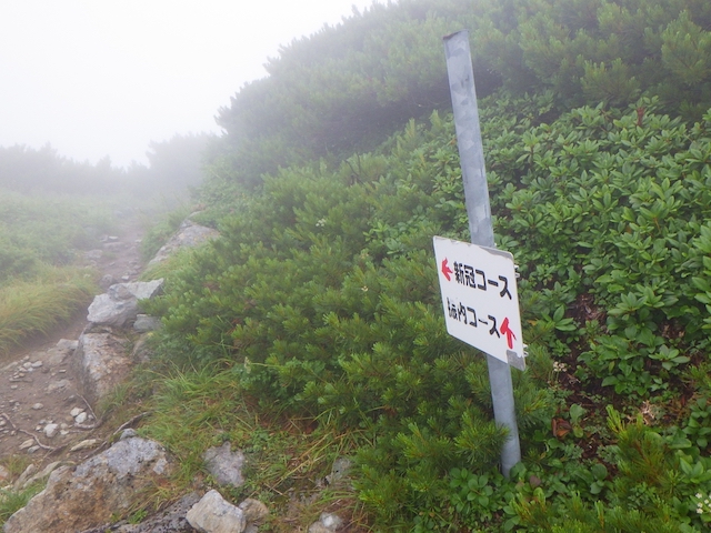 仲間の飲料に余裕があるとの事、少し下がらないといけない水場をパスして、先を進む。樹林帯を抜けるとハイマツ帯となり視界が開けて来た。少しきぶんも良くなりペースをあげる事が出来るようになって来た。ガスガスで時折、強風が吹き抜けてゆく。周囲はお花畑に変わって来ていた。熊のウンチもところどころに転がっているので、そんな場所では、ホイッスルを吹きまくって先を進む。しかし爆風で獣臭も辺りの物音もかき消されて、もはやヒグマなどを意識する事も難しい。 そんな中、先に登頂アタックしていた単独行の登山者が下山して来た。「頂上は爆風でしたぁ」と。そこで「小屋のスタッフに、下山は午後7時ぐらいになる事を伝えてもらえますか」と仲間から伝えてもらい、先を急ぐ。相変わらず登りがキツくなると足の攣りが出て来るので、何度かマッサージの小休止をしながら、午後3時16分、ようやく新冠コース(新冠ポロジリ山荘方面)との分岐点(標高2013m)に到着。