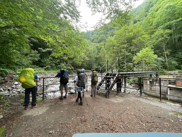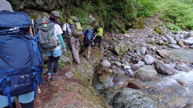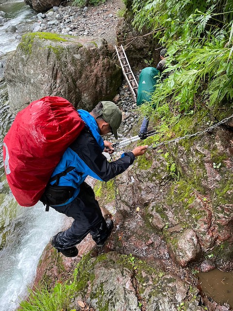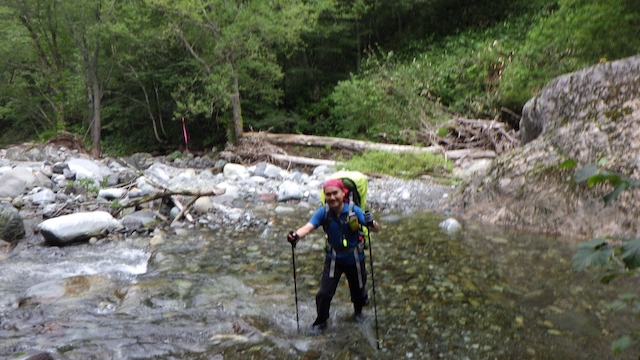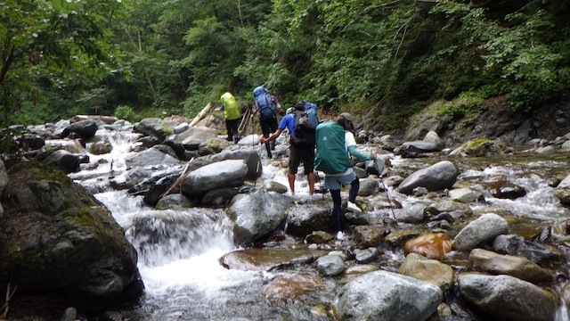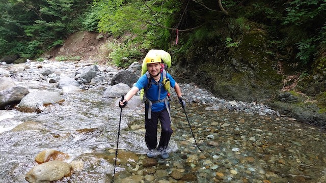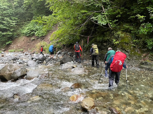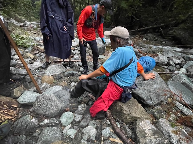 午前4時15分幌尻山荘を出発。靭帯を痛めた仲間も予想外に早いペースで渡渉を重ねることができた。午前5時5分、下から救助に来てもらった平取町山岳会の方々、幌尻山荘のスタッフ4名と無事に合流。皆さんフレンドリーで嫌な顔一つせず、始終笑顔で、流れの早い深いところでは、棍棒を川底に突き刺し渡渉をフォローしてくれた。