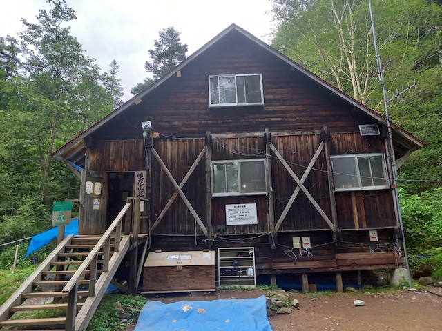 午前10時10分幌尻山荘着。スタッフが出迎えてくれてチェクイン。まず氏名、住所と行動予定を記入して、携帯トイレを1000円で購入。幌尻山荘では、色々なルール事がある。まずザックの山荘内の持ち込みは禁止。小雨振り始める中、屋外で仕分けと沢で濡れた衣服の着替え、沢履を脱いで屋外の下駄箱へ収納。食料、着替え、シュラフは、2階へ運び、指定された場所に借りたマットを敷き、場所を確保。