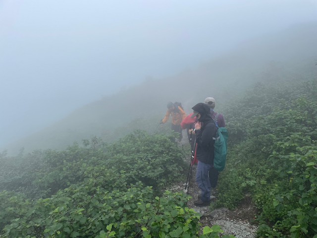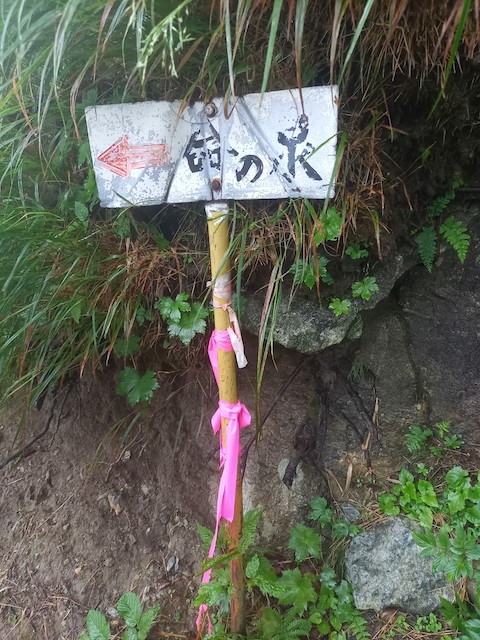 小雨降る幌尻山荘(標高950m)から午前11時15分登頂開始。樹林帯なので、雨はさほどではないが、小屋からは、見上げるように立ち上がる急登に加えて、レインウェアが蒸せるように暑く、体力がどんどん奪われていく。最初、標高差100mずつ刻み小休止を、仲間に伝えて先頭をとらせてもらうが、「スマホどこにいってしまったんだろう? 個人情報が詰まっている。見つからないとどうしよう。」と考えるだけで登ることに集中できない。そのうち300m程度ほど登ったところで、足が思うように上がらずペースも落ちてる自分に気がつく。どうやら渡渉で足を冷やしたのが、昨年、沢から転落して断裂したアキレス腱に影響が出ているかとも思った。「うーん、あと標高差1000m近く、果たして登り切れるか? 仮に登る事が出来てもリミットの午後6時半までに下山できるか?」と自問自答の中、不安が不安を呼び、ますますテンションダウン。そのうちに当初の標高100m登るごとの小休止どころか50mぐらい登るだけで、今度は太ももが攣り初めて来た。僕だけここで引き返して、他の5人だけで登ってもらおうかとも思った。「やっぱ今日は戻ろうかな?当初の予定通り明日の登頂にしようかな?」と思わず弱気の発言が口に出る。仲間からは、「4年も待って、やっとここまで来たんだよ。あと2時間頑張れば頂上だよ。休憩しながらでも登ろう。午後6時半の下山を今は気にしなくても良いから」と。気を取り直して、登る。また足が攣る。ただ足が攣った時の筋肉マッサージの仕方は、アキレス腱断裂の時のリハビリで整体師の先生に手解きをいただき心得ているので、その方法で、攣ってはマッサージ、登る、攣る、マッサージを繰り返し、午後1時13分、なんとか「命の泉」標高1550mまで到達。