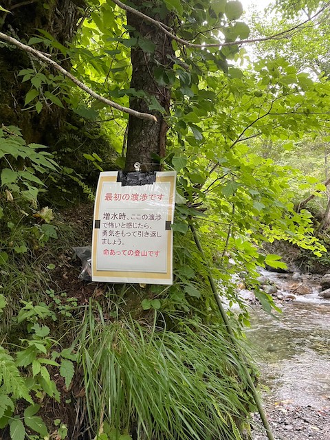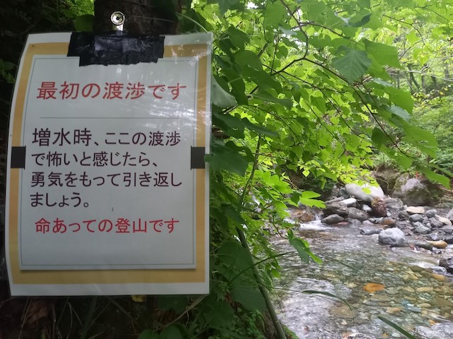 渡渉開始点に到着。立札に、「ここの渡渉で怖いと感じたら勇気をもって引き返しましょう。命あっての登山です。」とある。この最初の渡渉点が増水していて手こずるようであれば、とてもこの先の約2km、20数ケ所の渡渉はできない事を意味している。