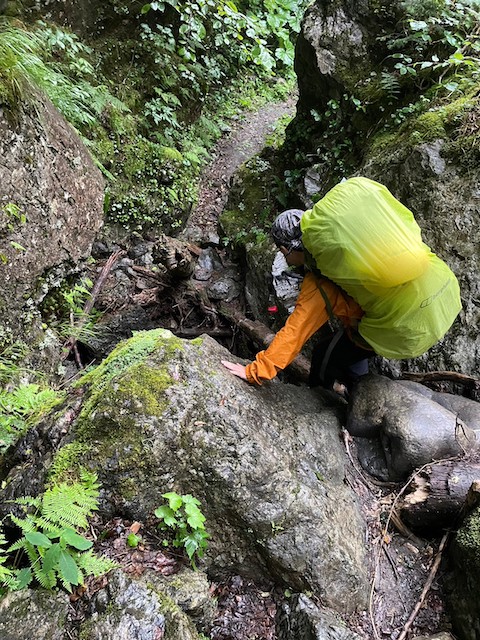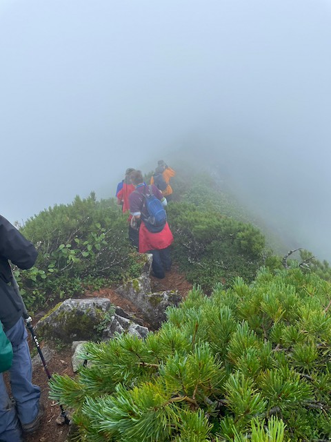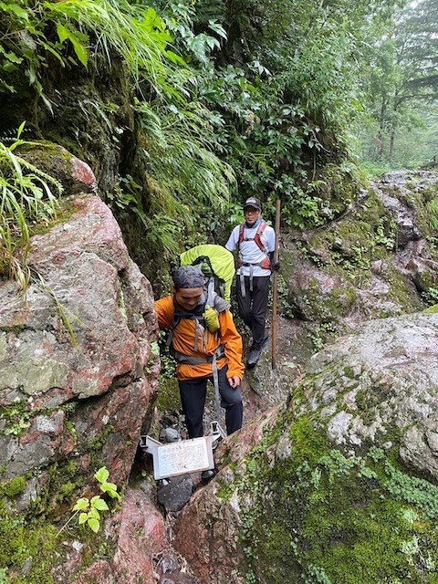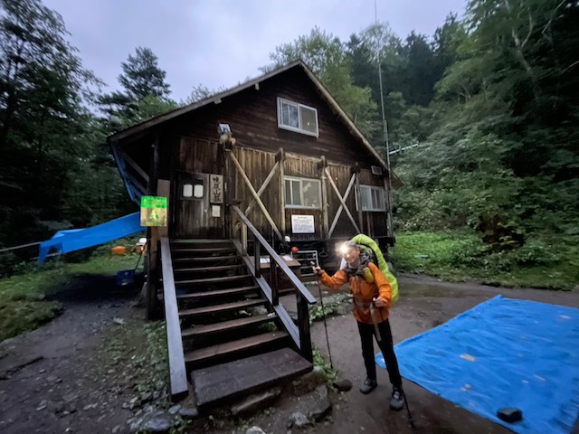 今回はアタックザックを新調していたので、ある程度は、事前に分別整理していたものの、想定以上に時間がかかる。スタッフからは、「明日は天気が悪くなる可能性が高いので、今日頂上アタックした方が良いでしょう。でも往復で最低7時間かかります。今からだとギリギリだと思います。午後6時ぐらいには薄暗くなって来るので午後6時半までに戻って来てください。夕食も屋外でシート張ったところで取っていただかねばなりませんし、消灯時間も午後7時半なので、遅くなると他の宿泊予定グループに迷惑がかかりますから。下山時間は、今からだとギリギリです。」とも言われ、その言葉に焦りながら出発準備ととよぬか山荘で作ってもらったおにぎりを口に押し込む。ザックは、床下の収納倉庫に納めたが、その時、どこに置いたかスマホが無いことに気がついた。2階もザックもアタックザックも探すが、見つからない。もうこのまま時間がかかれば、スタッフから、「時間切れ。もう登るな!!」と言われかねないので、スマホ無しで登頂する事に。とりあえず私のアップルウォッチウルトラで、位置情報や高度、脈拍、血中酸素濃度は拾えるので、行動自体は問題ないが、時間がなく水筒に沢水をエキノコックス感染しないように浄水して補充する事もできなかった。その時の水の残量は、約1リットル。約2時間登ると「命の泉」と呼ばれる水場があるので、足らなければ、そこで給水することとした。