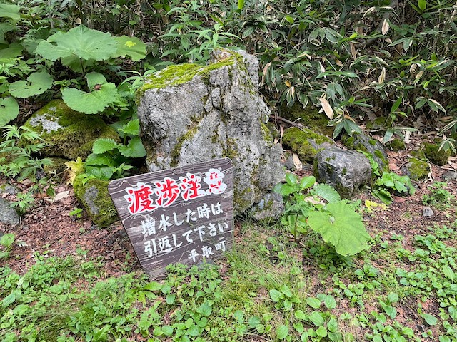 【連日の雨にも関わらず増水は見られず】 【渡渉注意看板】