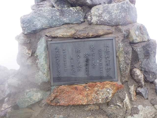 【暴風で記念撮影も容易ではなかった頂上】 【昭和50年7月に遭難された佐川さんの慰霊碑】