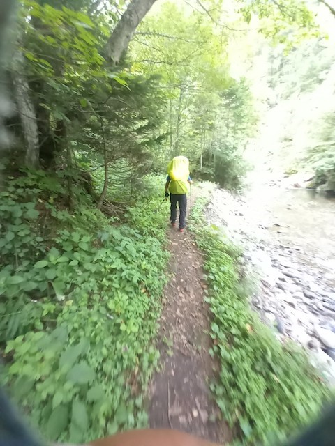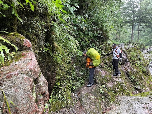 連日雨は降っていたものの最初の渡渉は、くるぶし上ぐらいで問題無し。モンベルのサワーシューズ(沢履)は滑らず、かつサワーソックスは、浸水しても自らの体温で温かく感じ快適であったた。途中で空き缶を下ろす幌尻山荘のスタッフの方と出会い挨拶。天気が崩れそうなので、今日中に登頂をする旨を伝え小屋への下山が遅くなる旨伝える。その後も、渡渉は、深い所で膝上20cmぐらい。水圧はあるものの危険を感じる箇所は1カ所もなく、無事に渡渉最終地点まで辿りついた。渡渉点を終えると、幌尻山荘が見えて来た。ホッとする瞬間だった。