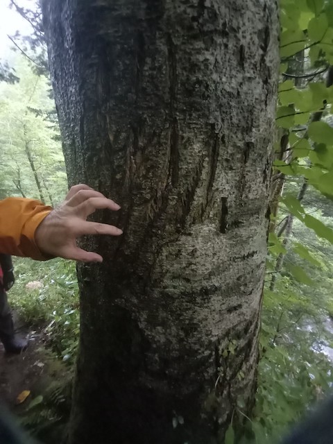 午前7時16分、8kmの林道を歩き切り、午前いよいよ渡渉区間に入る。手前の削り部分は、クサリが設置されているが、古いクサリでアンカーがところどころ抜けており、20kg近い装備で自重をかけるのは危険と、濡れた足場を滑らないように三点支持で進む。昨年7月の西吾妻での沢への転落してアキレス腱完全断裂したトラウマが頭をよぎる。しばらく歩くと、古いものではあるが、木の幹にヒグマの爪後が深く刻まれているものを発見。こんなのに、襲われたらひとたまりも無いなぁとビビる。