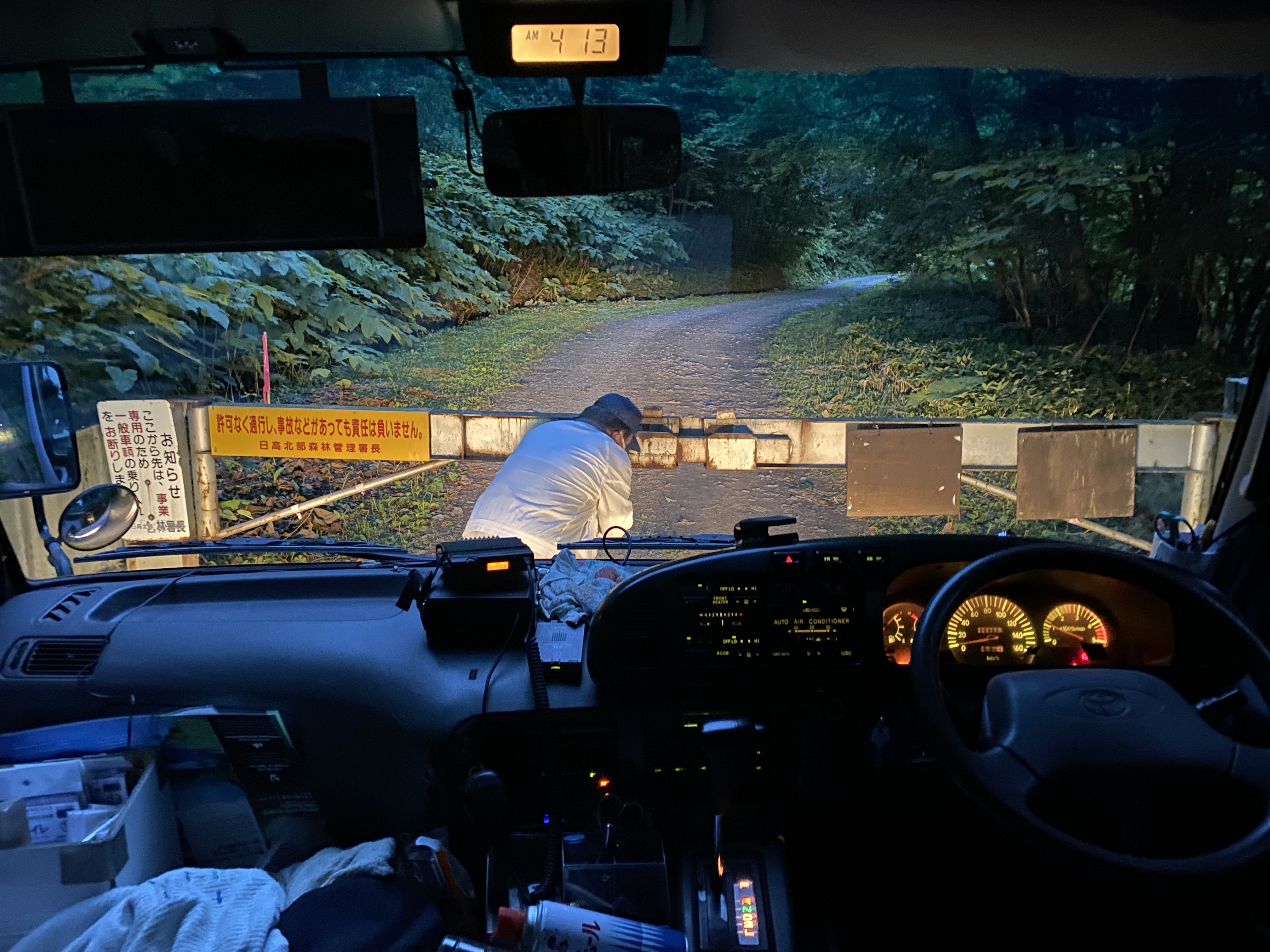 無事に午前6時45分、約2.8kmの渡渉を終えて北電取水口に到着した。ここで靭帯を痛めた仲間と看護師でもある山トモは、ランクルで登山口の第二ゲートへ。第二ゲートからは救急車で平取町の病院へ搬送いただいた。