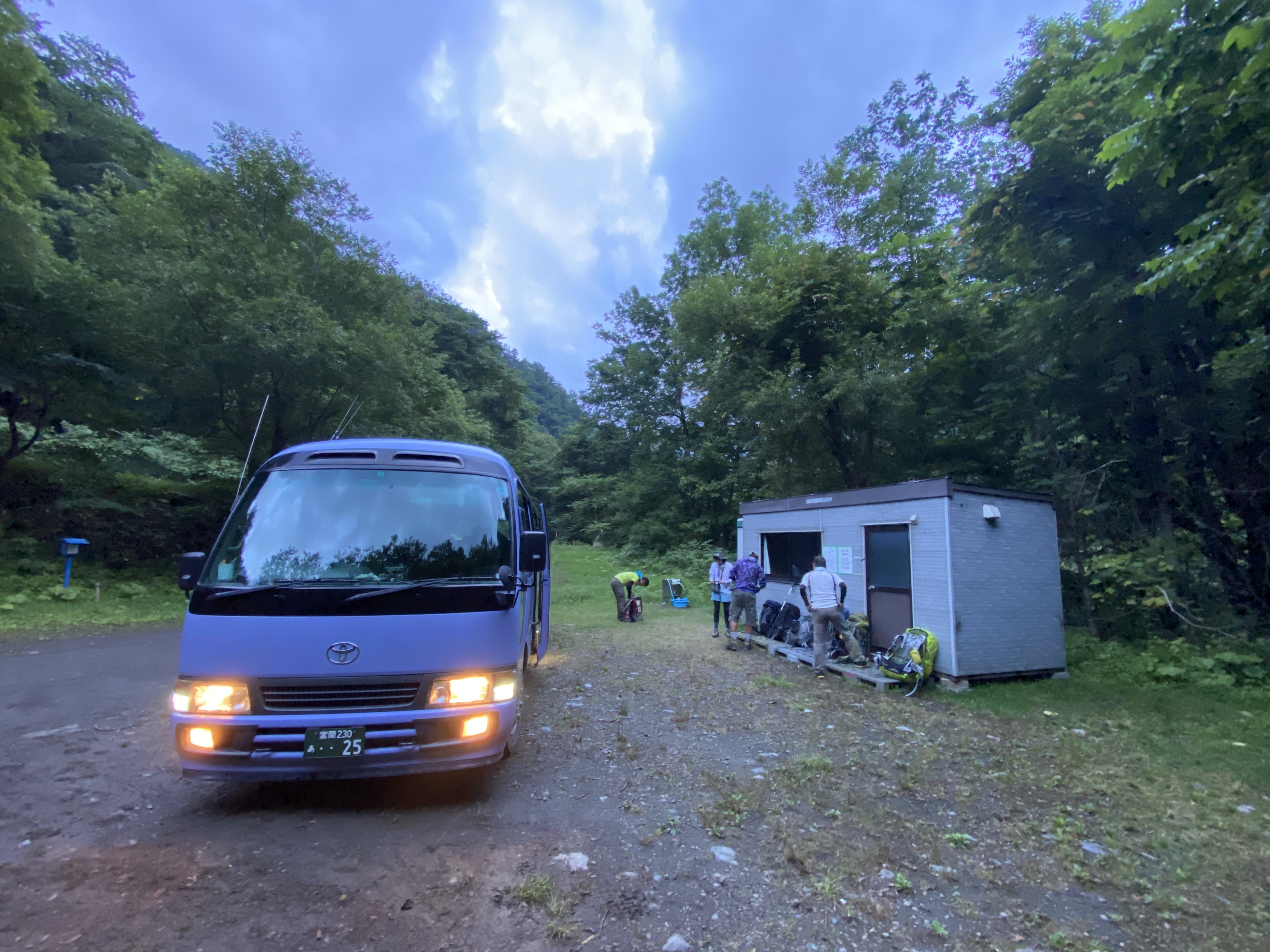 今回の登山計画は、北海道遠征期間:2023年8月3日(木)〜6日(日)とし、1日目に東京から新千歳空港からとよぬか山荘までレンタカーで移動、とよぬか山荘泊、2日目とよぬか山荘から幌尻山荘前泊3日目登頂、もしくは、コンデションが良ければそのまま登頂、下山後、幌尻山荘後泊の2つのプランを立てていた。週間天気予報は、前線が北海道北部に停滞、ところによっては大雨、と今週は連日不安定な天気と伝えていた。8月3日、新千歳空港に降り立つと小雨が降っていた。今回のパーティを構成する千葉、静岡、岩手の5名の仲間と合流、レンタカーをピックし、これ以上天気が崩れないようにと願いながら約2時間のドライブでとよぬか山荘へ向かった。連日の悪天候でとよぬか山荘は、キャンセル続出だった。シーンと静まりかえった山荘の宿泊者は、北陸からお越しで幌尻岳に登頂され、後泊の百名山達成された方、お一人のみで、ほぼ貸切状態。 「明日は天候シャトルバスが出るかわからないので、切符は明日出発前に購入してください。」とスタッフから説明を受けて、明日の天気が大丈夫か一抹の不安に。なぜならシャトルバスが出る=沢の渡渉は可能のバロメータだから。