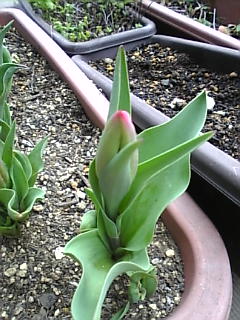 やっと、うちのチューリップの蕾が大きくなって、色が付いて来ました♪地面に植えるチューリップよりも、茎の育ちが悪いけれど、花が咲いてくれればいいんですけどね(^_-)-☆