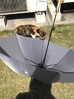 お昼休み、買い物をするため事務所から外に出たら、チビ猫(もう大きいけど・・・)が、干してあった傘で遊んでいました私が写真を撮ろうと思って、そばに寄ったら、チビ猫が私のほうに向かってきちゃいました。写真のあと私の足元までやってきました。このチビ猫は、自分は猫だと思っていないようだ・・・と会社の人たちが話していましたよ。ぜんぜん、人間を怖がらないし、反対に寄ってくるんですもん・・そこがまたかわいいんですけどね~~♪ただ、外で仕事をしていると邪魔をするのがちょっと困りますけど・・・