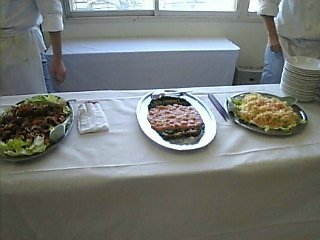 今日は、成ちゃんの学校の3年生最後の晩餐ということで、ビュッフェパーティーがありました。保護者や3年間お世話になった先生方を招待してのパーティーで、仕事を一日休んで、自転車で学校まで行ってきました。11時半からだというので、急いで行ったら、保護者の方はたった一人だけしかいなくて、あとは先生方が五人。もっと保護者がいると思っていたので、ちょっとびっくり。3年生の一人にバーティー会場へ連れて行ってもらい、4階にある教室(パーティー会場)へ。(結局、私とりえちゃんのお母さんとおじいちゃん、あと女の子のお母さんの4人だけしか保護者は来ませんでした。)いろいろな料理があちこちに並んでいて、成ちゃんもいました。成ちゃんは中華料理の担当で、チャーハンを作るとか言っていたのに、結局他の子が作ったとか・・・チャーハンやエビチリ、から揚げ餡かけが並び、他には、焼肉(うちで持っていったホットプレートで焼きながら、配ってくれました。)ピザやパスタ、寿司、スープ、ロールキャベツ。そして、デザートにケーキやシュークリーム、ゼリーなどもあって、食べられるものみんな食べました。何種類かは、もうお腹がいっぱいで食べられませんでしたが、みんなおいしく出来ていて、満足でした。お父さんにも食べさせたかったなぁ~~って思いました最後に、生徒たちからお世話になった先生方へプレゼント。その後、私たち保護者にも子供たちから花のプレゼントを一言メッセージを言ってから、渡してくれました。たったの3人だけだったので、すごく目立ってしまいましたが・・・なんていう花か私にはわからないんですけど、かわいい花です。