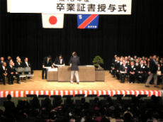 今日は成ちゃんの卒業式でした。お父さんが休みだったので、一緒に卒業式に行ってきました。卒業式は、入学式の時と同じ場所、所沢にある市民文化センターです。式は午後1時からだったのですが、車だったので駐車場が混むといけないと思い、早めに家をでました。10時過ぎに家を出て、会場に着いたのは10時50分ごろ。ちょうど成ちゃんたちが会場に着いた時でした。学生たちは、10時50分に会場に集合をして卒業式の練習があるので、成ちゃんたちは早めに家を出て、電車で出かけたのでした。お父さんと二人で、お昼を食べてから受付をして会場に入りました。りえちゃんのご両親と会いました。うちのお父さんとは、初めてのご対面で、3人で挨拶しました。式が始まり、一人ずつ証書授与。5つの科が一緒の合同卒業式で、調理師科から始まり、高等科、栄養士科、臨床検査技師科の順番でした。学園長からの手渡しでしたが、入学式と同様、髪型チェックをしながらの授与式でした。学園長がダメだと言ったら、卒業証書はその場ではもらえません。また、髪型が坊主頭等で学園長が気に入った人に関しては、その場で一緒に写真撮影です。成ちゃんの場合は、髪型も大丈夫だったので、無事証書をいただくことが出来ました。高等科の生徒たちは全員合格(笑)で、証書をいただくことが出来ました。4,5人の子達は、丸坊主になってきたので、学園長と一緒に写真撮影をしてもらえました。調理師科や栄養士科、臨床検査技師科の中には何人か不合格で、証書をいただけませんでした。この学校独特のユニークな式で、途中眠気が襲っては来ましたが(笑)最後は楽しい卒業式でした。泣き虫な私ですが、さすがに今日はぜんぜん泣く気になりませんでした~~さて、今度は22日の裕ちゃんの卒業式です。こちらは、きっと泣いてしまうかも・・・