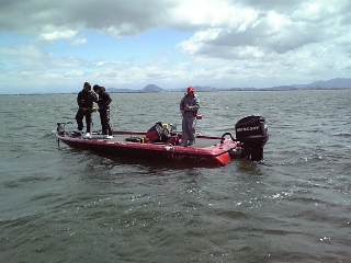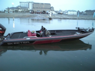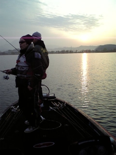 今日は三日目の琵琶湖ですMr.big艇も出撃予定ですが、昨日ジャックプレートの調整をしたので試乗がてら一人で出撃ですスロープに到着するとまだ夜が明けてないというのに2艇も出艇しています…せっかくボートの少ない平日に休みを取ったのにガッカリです…Mr.big艇は居ませんが準備を済ませボートを降ろす事にしました…私は一人でボートを降ろす時ウインチベルトを一定の長さに弛ませて車を勢いよくバックさせて急ブレーキを掛け惰性でボートをトレーラーから離しているのですが、この日ブレーキを掛けた時変な音がしました…車から降りてボートを見るとかなりトレーラーから離れてます…『えっ何で』と思いましたが、よく見るとウインチベルトが切れてます…当然の事ながら惰性で流されてますので私のボートは『無人くん』…幸い無風でしたのでMr.bigさんの到着を待ちます。途中到着した知らないボーターさんが不思議そうな顔で私とボートを見ているので、メッチャ恥ずかしかったです…しばらくするとMr.bigさんと春一番さんが到着し私とボートを見て二人に大爆笑されました…Mr.big艇に助けて貰い事無きを得て複雑な心境で記念撮影しときました…その後出艇しましたが、私の集中力はウインチベルトと一緒に切れた様で、この日はスピナーベイトとスコーンで1バイトずつありましたが乗せる事が出来ず10時頃に終了としました…ちなみにMr.big艇は春一番さんがアワセ切れがあったのみだったそうです。この3日間全くいいトコ無しでした…