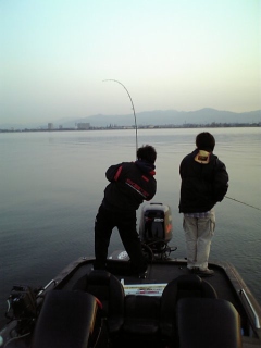 今朝は朝の冷え込みがきつくスロープに到着し寝ているイマタクさんを叩き起こしソッコーで準備し私の運転でファーストポイントへZX250を走らせます防寒着を忘れたお二方はかなり寒そうです…ポイントに着き3人で爆裂トークをしながら一通り攻めますが反応ナシ…爆裂トークを続けているといきなりイマタクさんがフッキングイマタクさんいわく『小さいですわ…』しかしなかなか魚があがってきません…魚が浮いた瞬間に私がネットランディング!グッドコンディションの45cmその後もいろんなポイントをランガンしながら爆裂トークは続きますが反応ありません…いつも一人で釣りをする機会が多い私としてはみんなでワイワイやりながら釣りをするのがかなり新鮮なんですが…そうこうしていると気温も上がり暖かくなってきてボートも増えていてめぼしいポイントにはほとんどボートが入ってます…しばらくするとイマタクさんが『本日のメインイベントの夜のチャンコ鍋に備えて車で寝たい』との事でZX250を乗っ取りお杉さんと冬ポイントへ走ります釣れない時間帯だし時間もあまりないのでお約束のコナキー一本勝負でいく事に…数投目に根掛かったようなアタリでゴリ巻きしてくるとヘビーロッドがギャンギャンに絞り込まれジャンプした魚体を見てお杉さんが『ロクマルあるんじゃないですか~』と大興奮。お杉さんにネットランディングして貰い計測すると57cmのデカバスですウエイトは3250gでまだまだスポーンは先の様です…その後は同じ様な条件のポイントを回りますが反応ありません…時間も昼となりスロープに戻り記念撮影 今日は長浜にしてはよく釣れた日らしく、同じマリーナの釣りウマOさんはロクマルと57cmをジョインテッドクローでキャッチして2本で約8kgの驚愕のウエイトを叩き出していました午後からはこれまたお約束のボートメンテタイミングよく大掃除していた西島さんから洗浄機やポリッシャーを貸して貰いイマタク艇を新艇状態に仕上げましたそして夜はメインイベントの『双隆』のチャンコ鍋へなかにし社長や大酒豪小石さんとみんなでワイワイと夜も爆裂トーク大会となりました