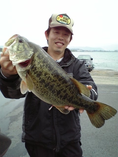 今日はイチ早く環境対策エンジンに載せ換えたMr.big艇のオーナー艇ガイドです朝イチから先日50Upを連発したポイントへボートを走らせますヤマハHPDIエンジンの静かさにビックリです…ポイントに到着し水の色を見ると白く濁っていて少しがっかりしますが一斉にジグヘッドをキャスト!しかし反応はありません…そこでピン撃ちにシフトしてもらうとMr.bigさんにデカバスがヒット!腹パンパンの53cm2800gで目玉は少年の眼の様なバスですMr.bigさんの『獲ったど~』との雄叫びが早朝の琵琶湖に響き渡ります最近のバスは何故か浅いレンジでもエア抜きが必須…手早くエア抜きをしますその後ジグヘッドのロボットシェイクで攻めていた春一番さんが私が先日55cmをヒットさせたピンにキャスト!一部始終を見ていると『きました~』とまたまたヒット~水中の魚体を見ると55Up確定です…私がネットランディングして全員ビックリ『デッカ~これはロクマルイッたね』とボートの上は大騒ぎ計測すると63cm4500gの10ポンドオーバー今度は目玉はパチンコ玉の様です…今度は春一番さんの『ロクマル獲ったど~』との雄叫びが琵琶湖に響き渡りますしばらくアタリが無いので私もキャストを始めると今度は私にヒット全くリールが巻けず上がって来ません…やっと上がって来て春一番さんにネットランディングして貰い『これもロクマルイッたか?』と思いましたが1cm足らず59cm3800gやはり1cmの壁は厚いです…その後は時合いが去ったのか反応がありません…夕方から雨が降り出し期待が高まりますがノーバイト…期待していたポイントは水が真っ白で雨足も強まってきたのでここで終了としました今日は朝イチのみのラッシュで3本で驚愕の11kgオーバーでしたからゲストさんも私も大満足でした春一番さんは興奮のあまり壊れてしまい釣りが続行できない状態になり途中で失神されましたのでロクマルはMr.bigさんが持って撮影しました帰りに面白い光景がありましたので車の中から写真撮影フルサイズバスボートが交差点に並ぶのは琵琶湖でも長浜ならではの光景ですね