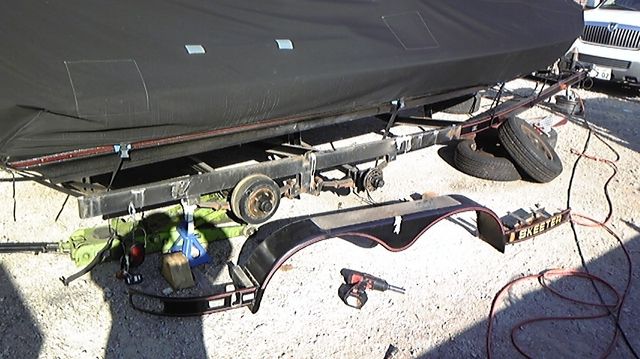 Mr.bigさんのスキーターのトレーラーが大変な事になっています・・本人さん曰く「旧規格の車幅の為、254cm有り250cm以内にしないと車検は、取得出来ません・・仕方ないから車幅改造を自らトレーラー改装中」との事・・シャコタン好きの私としてはタイヤとフェンダーの被りっぷりがシブ過ぎだと思います リニューアルついでにトレーラーもベッタベタのシャコタンにしてみては・・