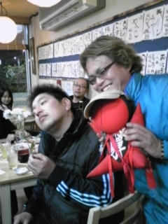 夕べは『T.REXエロ店長ファミリー』とジャックさん、おのやんと行きつけの刈谷の『豊蔵』へ…みんなで食事しながら飲んでると『三河のサディスト』イマタクさんが乱入!!そこからはいつものパターンでドンチャン騒ぎ!『エロ店長』は『三河のサディスト』に眉毛にワカメを乗せられておりました…今日ワタクシが二日酔いだったのは言うまでもありません…。