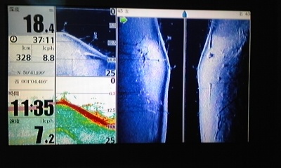 こちらは3画面です 通常の魚探映像を表示する事によりボトムの硬さ等を判別出来ますこの3画面が一番使用頻度が高そうです