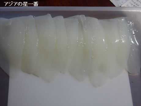これはイカです。サバとイカの刺身、どちらも美味しいですぞ。