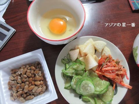 納豆、生卵、酢の物などです。