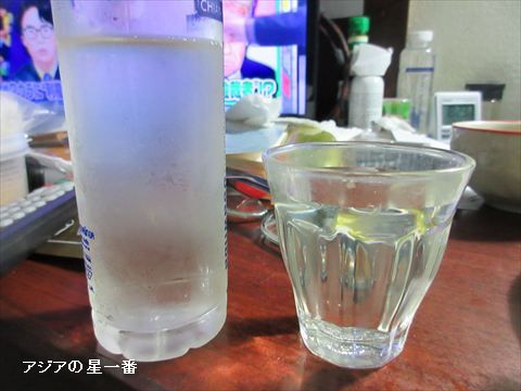 酒です。グラスのお猪口で飲みます。この方がコップ酒より