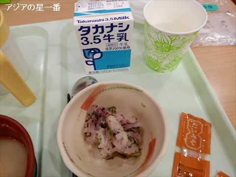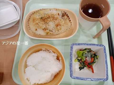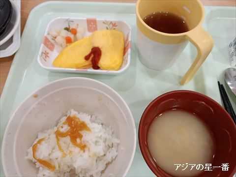 朝食です。カニ海苔ご飯、味噌汁、玉子焼き、お茶です。一時良くなった
