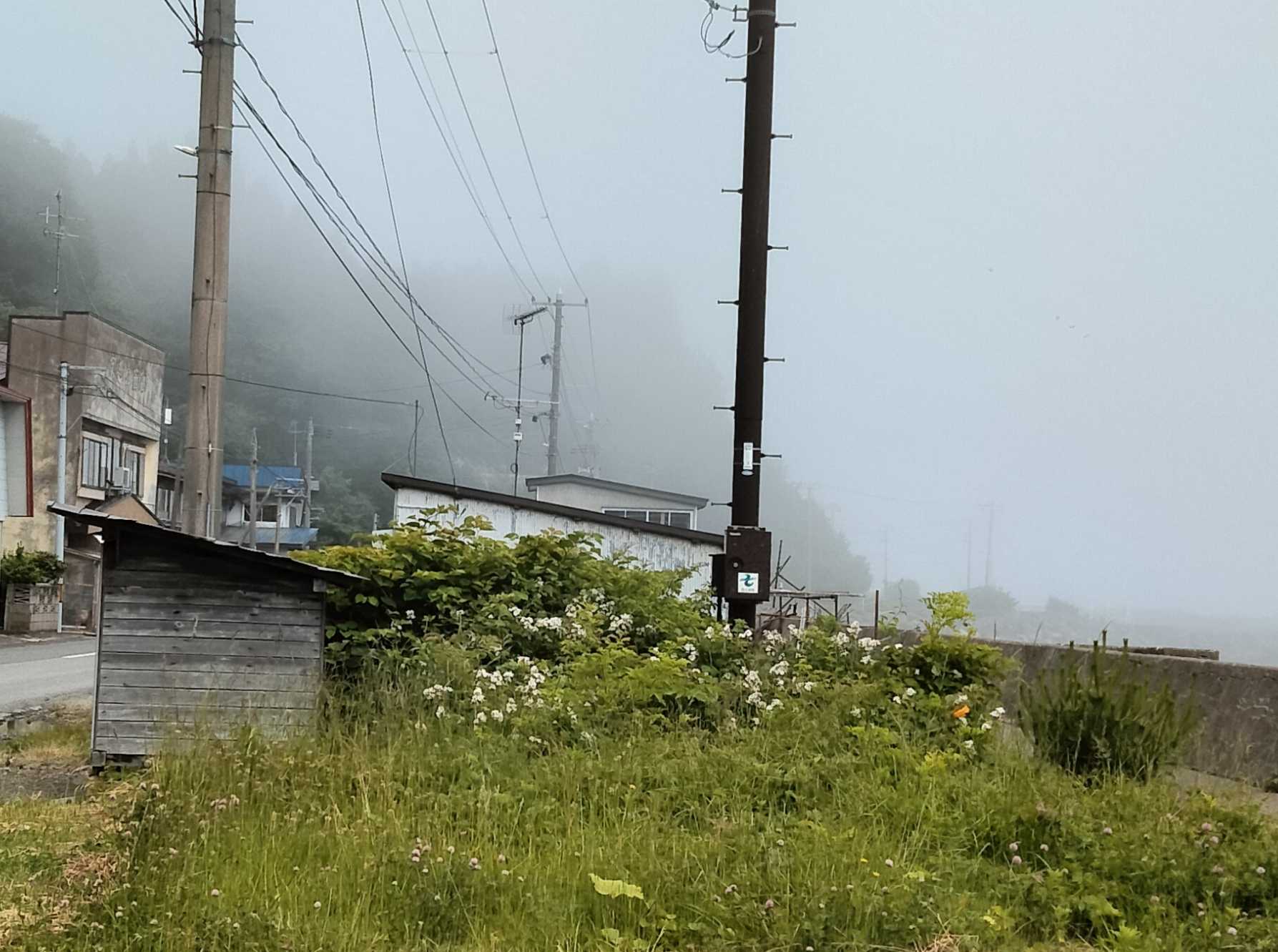 今日は霧が掛かったんですよ。ココらへんは強い土地ですよね。地の育みが強いというか船が陸においてあります。普通に船の上が森になるのではないかくらい草が生えてる。花がコンクリートから生えてる。店で売られてるような花がコンクリートからはえてるんですよ。私のコンクリートだらけの敷地にもコンクリートから芽を出して花を咲かせてる。本当に強い土地だなぁと思います。なよっとしてませんよね。しっかり咲いています。松も芽をだすんですよ。10年後には2mくらいになりますか?私の家にもマーガレットがコンクリートから生えていますが三厩地区は漁港を超えて車で走るとマーガレットの白い花がリレーして咲いてますよね。ここまで種が風で飛んできて咲いたんだとおもいすよ。ここまで花が育つなら花を楽しむ町にすればいいのに。