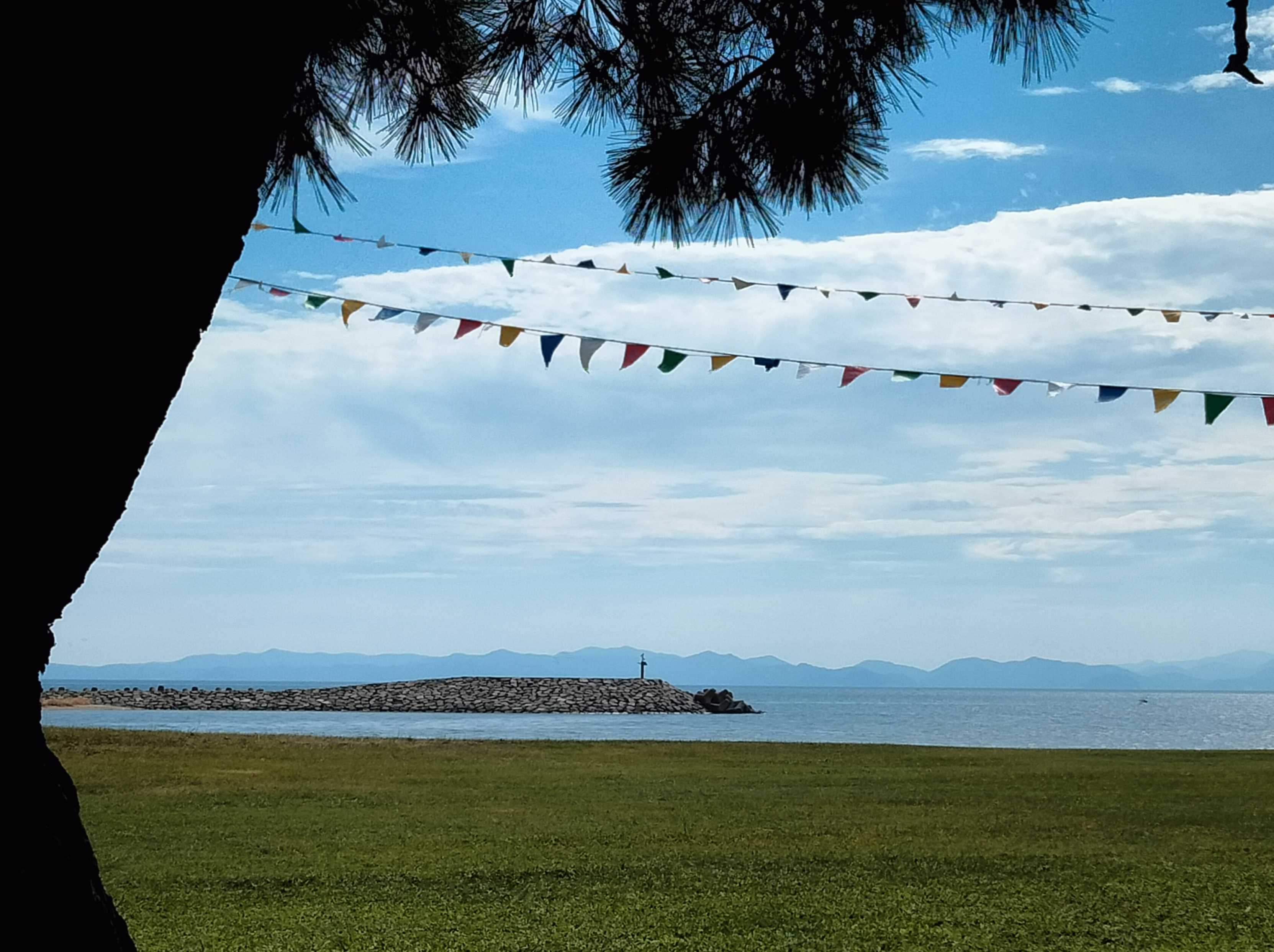 アレ十字架だったらいいのになぁ海の先の石を積んだ上にあるアレ十字きっておがんでやるのになぁ夏になったら星の出てる夜に月を眺めながら歌でも作ったらイイ曲でもできるのかなぁあの石ももっとゴツゴツしてたらいいのに整いすぎていてだからイイ曲ができないんだたぶん高校の時に授業に出ないで海辺で遊んでたから良くなかったのかなぁちゃんと勉強してたら今頃思った通りの人生にになってたろうか100点取ってたら母ちゃんを笑わせてたら今頃はもっと何もかもやってることが面白くて 濃かったかなぁ‥遠くの島がブルーグレーでその向こうの島はよく見ないとあるんだかないんだかわからないくてなんか自分みたい。やってることもパッとしないやあの積んでる石がもっととんがっててあそこに十字架でも立ってたら俺はもっと違っていた‥たぶん‥消えそうなブルーグレーの島も気にならず薄いなんてあるかどうかもわからないなんてどうでもよかったんだたぶん‥あの旗三角のハッピーだよね。青空が楽しい。でもいつも焦ってる俺はなんかあの旗もどこか楽しくなくて何やったらいいかどうしたらいいかも浮かばないで曲を作ってる。兄貴が置いていったギターなんかやれないかと弄ってるもっと早く兄貴に聞いてたら今頃はこんな恥ずかしがらずにやれてたかなぁどうでもいいような後悔しかなくてなんかいえば誰かが悪くて出来ないのは人のせいで夢は神頼みしたくて十字架を探してるあの石ももっとゴツゴツしてたらいいのに整いすぎていてだからイイ曲ができないんだたぶんあの石がもっと尖っていて不揃いでその上に十字架でもあったなら俺の人生はもっと変わってたんだたぶん‥