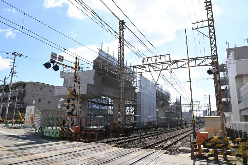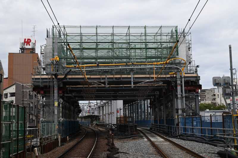 こんにちは。こんばんは。 崇禅寺駅の9月の様子をレポートします。 1枚目は崇禅寺駅の梅田側です。 先月と大きな変化はないようです。 2枚目は大宮橋踏切の梅田側です。 後ろのステージ上にフェンスと足場が作られています。工事が本格化しているようです。 3枚目は大宮橋踏切の淡路側です。 こちらも後ろのステージ上の足場とフェンスの範囲が広がっています。 4枚目はライフ前と3ゲートの間です。 鉄筋工事が進んでいます。淡路側では型枠が作られているのでコンクリートも近そうです。 5枚目はハラカイ踏切の梅田側です。 桁は完成して足場類も撤去されています。 高架橋ステージの解体も進んでおり、現在5スパン目を工事中です。 今月は以上です。来月も引き続きレポートします。