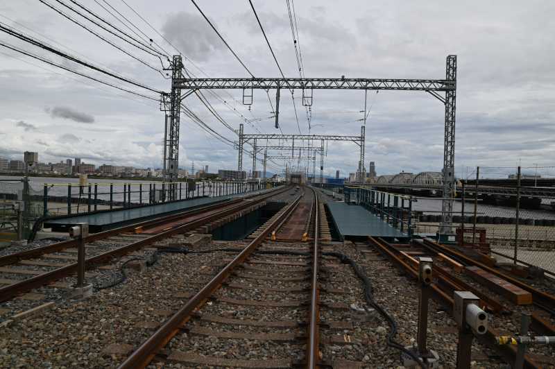 2枚目は難波方面に戻り淀川西岸踏切から難波方面淀川橋梁の様子です。