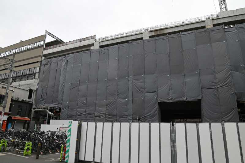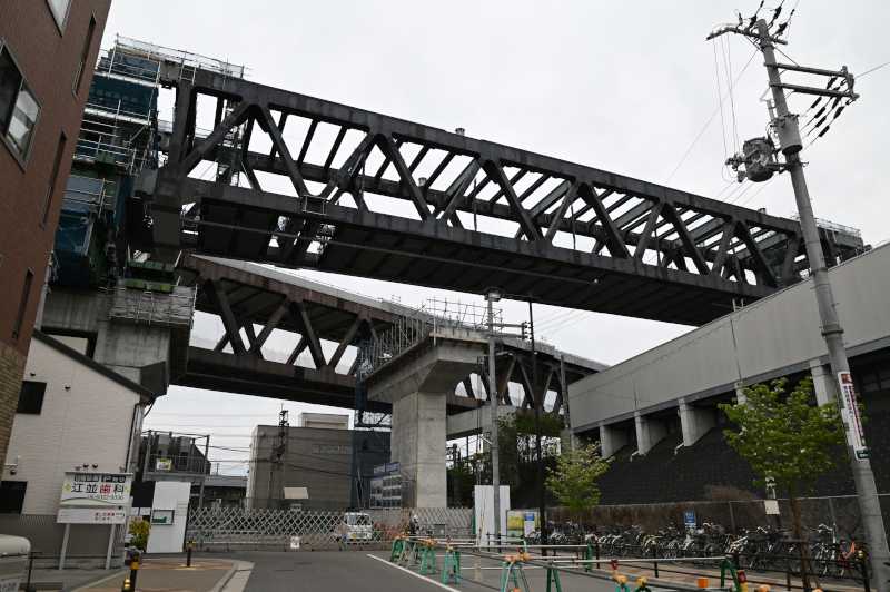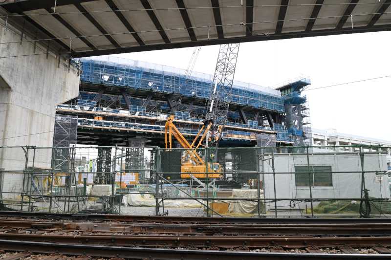 高架から少し出るように鉄骨が組まれそこで作業をしています。