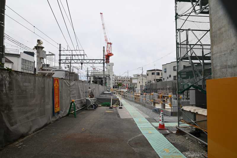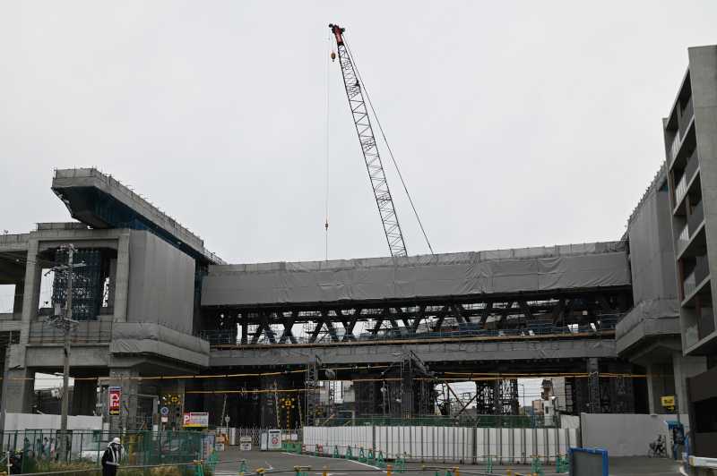 1枚目は住宅踏切の様子です。トラス本体は組み上がりました。現在は上下の鉄骨部分にて